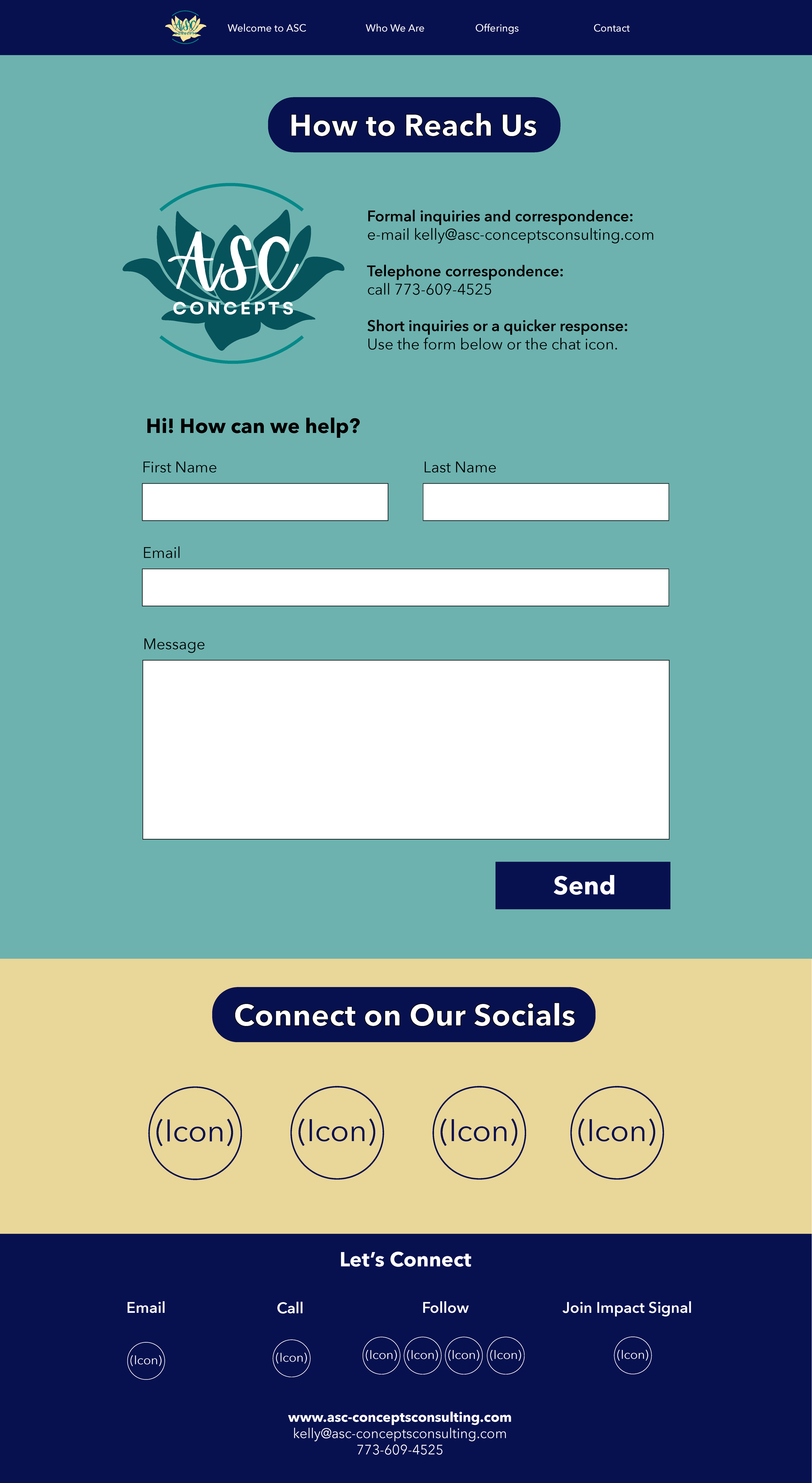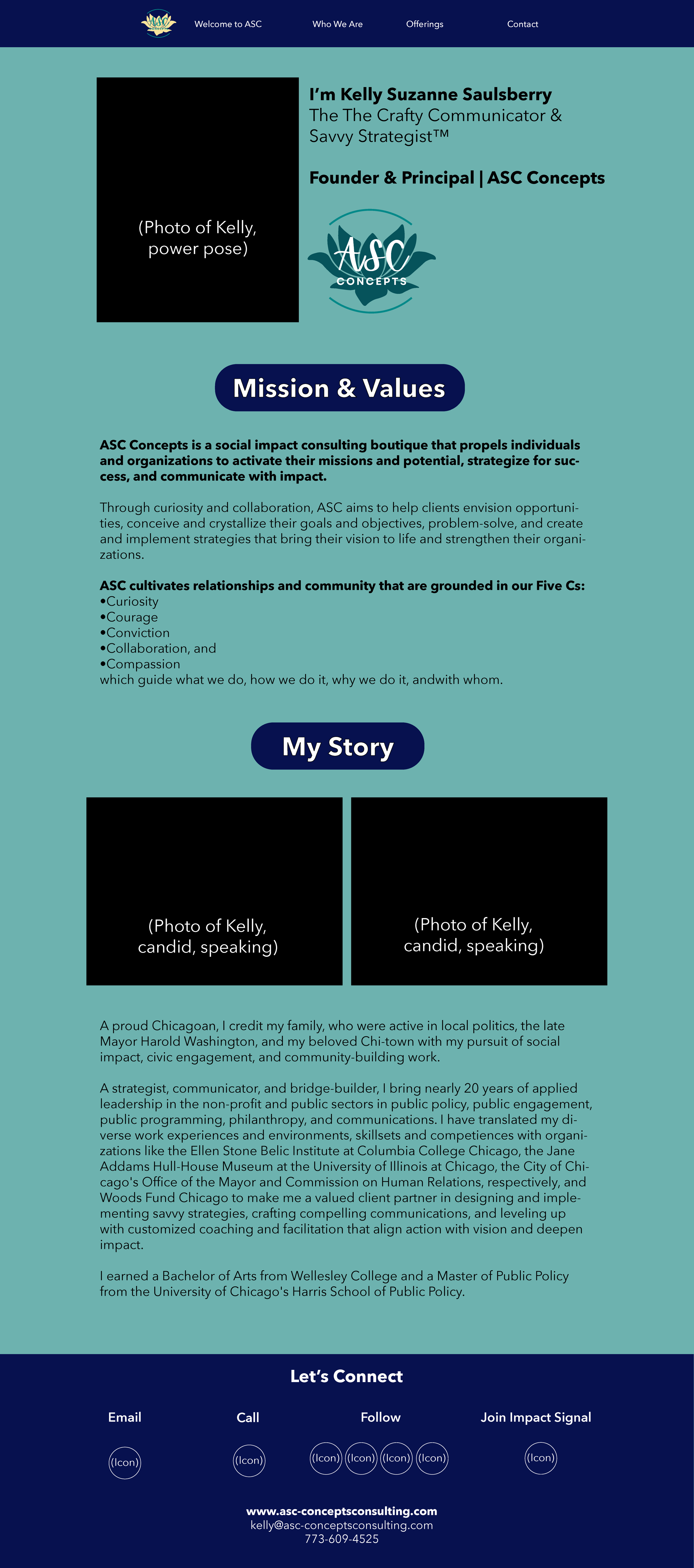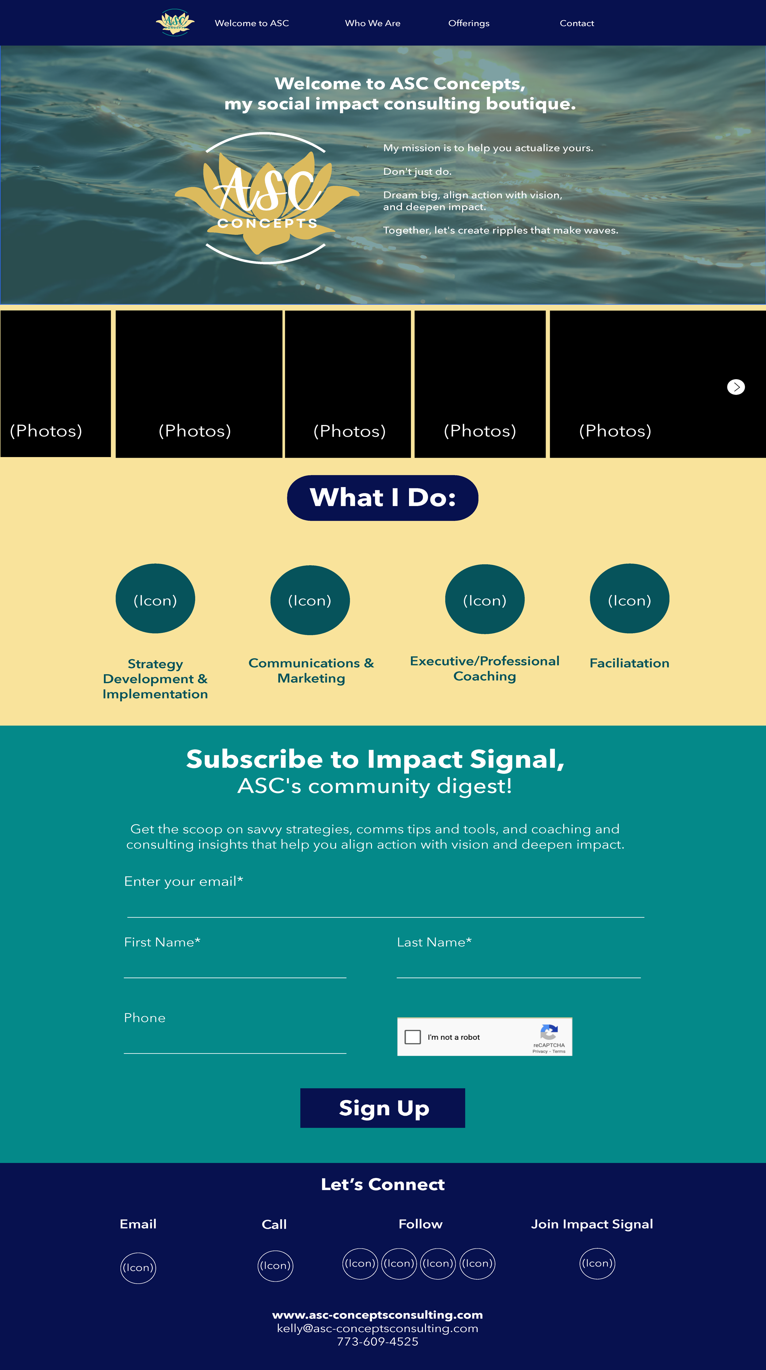 Project(s): Brand and design for, ASC Concepts, a local social impact consultancy agency by reviewing, assessing, and improving upon preexisting work and copy. Tasks included strengthening the logo, improving the website for user experience, and editing website copy for redundancies, passive voice, and clarity. ASC Concepts currently works with four partners and five organizations.